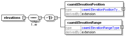| source | <element name="elevations"> <complexType> <sequence maxOccurs="unbounded"> <choice> <element name="ElevationPosition"> <complexType> <complexContent> <extension base="caaml:ElevationPositionType"/> </complexContent> </complexType> </element> <element name="ElevationRange"> <complexType> <complexContent> <extension base="caaml:ElevationRangeType"/> </complexContent> </complexType> </element> </choice> </sequence> </complexType> </element>  |