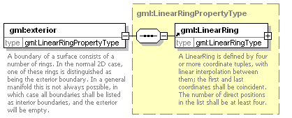 | source | <element name="exterior" type="gml:LinearRingPropertyType"> <annotation> <documentation>A boundary of a surface consists of a number of rings. In the normal 2D case, one of these rings is distinguished as being the exterior boundary. In a general manifold this is not always possible, in which case all boundaries shall be listed as interior boundaries, and the exterior will be empty.</documentation> </annotation> </element>  |