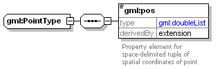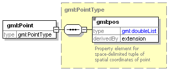 | source | <complexType name="PointType"> <sequence> <element name="pos"> <annotation> <documentation>Property element for space-delimited tuple of spatial coordinates of point</documentation> </annotation> <complexType> <simpleContent> <extension base="gml:doubleList"> <attribute name="srsDimension" type="positiveInteger" use="required" fixed="2"/> </extension> </simpleContent> </complexType> </element> </sequence> <attribute ref="gml:id" use="required"/> <attributeGroup ref="gml:SRSReferenceGroup"/> </complexType>  |