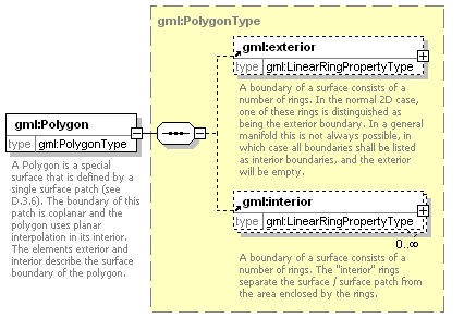 | source | <element name="Polygon" type="gml:PolygonType"> <annotation> <documentation>A Polygon is a special surface that is defined by a single surface patch (see D.3.6). The boundary of this patch is coplanar and the polygon uses planar interpolation in its interior. The elements exterior and interior describe the surface boundary of the polygon.</documentation> </annotation> </element>  |