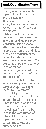 | source | <complexType name="CoordinatesType"> <annotation> <documentation>This type is deprecated for tuples with ordinate values that are numbers. CoordinatesType is a text string, intended to be used to record an array of tuples or coordinates. While it is not possible to enforce the internal structure of the string through schema validation, some optional attributes have been provided in previous versions of GML to support a description of the internal structure. These attributes are deprecated. The attributes were intended to be used as follows: Decimal symbol used for a decimal point (default=”.” a stop or period) cs symbol used to separate components within a tuple or coordinate string (default=”,” a comma) ts symbol used to separate tuples or coordinate strings (default=” “ a space) Since it is based on the XML Schema string type, CoordinatesType may be used in the construction of tables of tuples or arrays of tuples, including ones that contain mixed text and numeric values.</documentation> </annotation> <simpleContent> <extension base="string"> <attribute name="decimal" type="string" default="."/> <attribute name="cs" type="string" default=","/> <attribute name="ts" type="string" default=" "/> </extension> </simpleContent> </complexType>  |